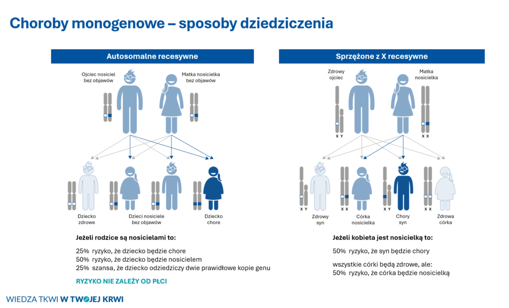 Każdy może być nosicielem różnych wariantów (zmian genetycznych) w swoim materiale genetycznym. Niektóre warianty nie mają wpływu na nasze zdrowie i rozwój, podczas gdy inne mogą powodować choroby genetyczne. Jeśli dana osoba ma pojedynczy patogenny wariant w jednym z genów, ale nie powoduje on choroby, jest nosicielem choroby recesywnej. Jeśli dwoje nosicieli tej samej choroby recesywnej planuje dziecko, istnieje ryzyko, że odziedziczy ono warianty od obojga rodziców i będzie chore.